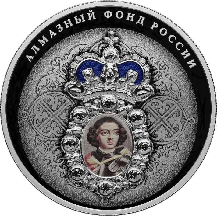 The reverse depicts Peter I's portrait badge with colored elements against a traditional Russian ornament, laser-treated for a matte finish. Around the top edge is the inscription ‘АЛМАЗНЫЙ ФОНД РОССИИ’ (DIAMOND FUND OF RUSSIA).