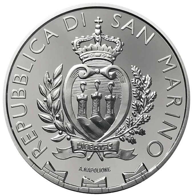 Description: The coat of arms of San Marino, featuring its three towers on green hills within a crowned oval frame, flanked by laurel and oak branches. The base bears the word "LIBERTAS" on a banner. The engraver's signature "A. NAPOLIONE" appears below.