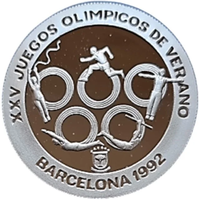 Five Olympic rings, each featuring an athlete in action, above the Equatorial Guinea coat of arms.