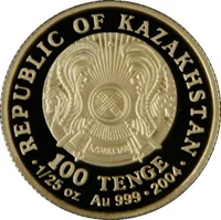 Description: The obverse center features the Republic of Kazakhstan emblem above the number "100" and the word "TENGE." Around the circumference, a raised edge frames the inscriptions "REPUBLIC OF KAZAKHSTAN," "1/25 oz Au 999," and the year "2004," all separated by dots.