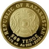 The obverse features the Republic of Kazakhstan emblem with "500" and "TENGE" below it. Around the rim are the inscriptions "REPUBLIC OF KAZAKHSTAN", "1/4 oz Au 999", and "2005", separated by dots.