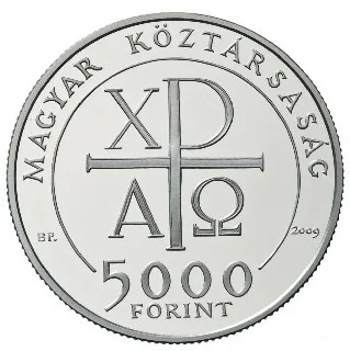 The obverse features the Christ monogram from the Debrecen Reformed College pulpit, alongside the standard denomination, legend, mint mark, and issue date.