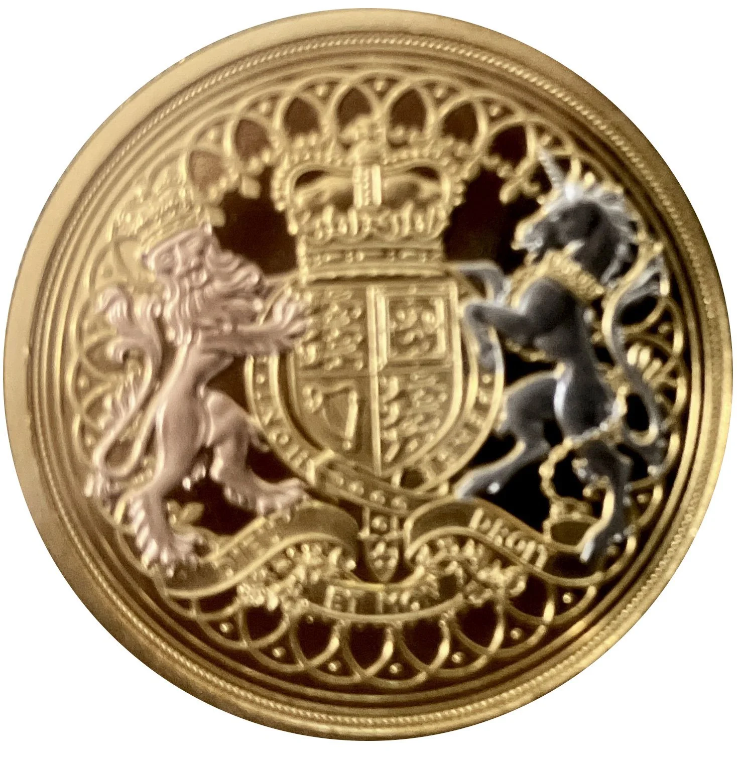 A modern interpretation of the UK coat of arms within a regal border. A rose gold Lion and a white gold Unicorn support the shield, which is accompanied by the Garter bearing its motto and the monarch's motto, *Dieu et mon Droit*.