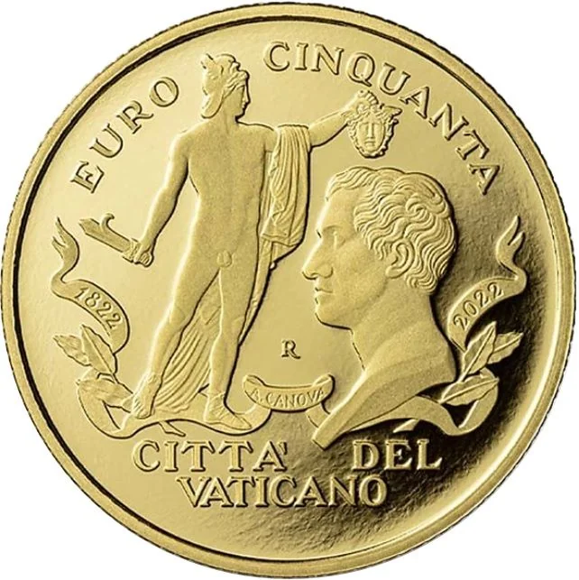 The reverse shows Canova's statue of Perseus Triumphant in the Vatican Museums, with his 1812 marble self-portrait in profile. Laurel leaves and ribbons complete the design.