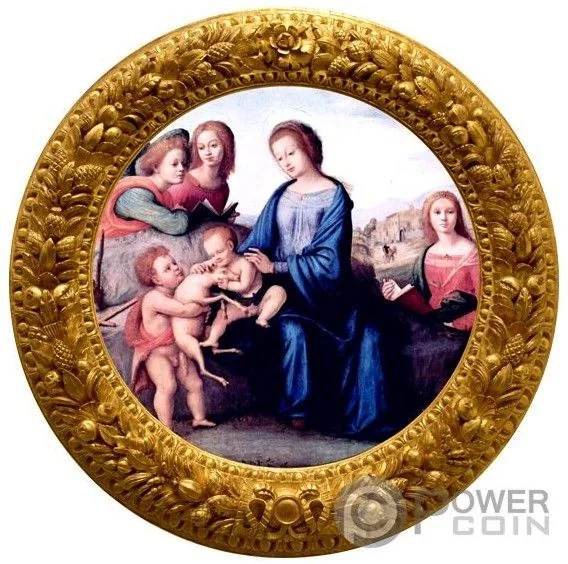 Piero di Cosimo's 1520 "Madonna and Child with Saints and Angels," framed by a wreath.