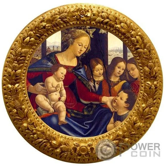Detail of Domenico Ghirlandaio's "Madonna and Child with Infant St. John and Three Angels" (c. 1485-1494), framed by a wreath.