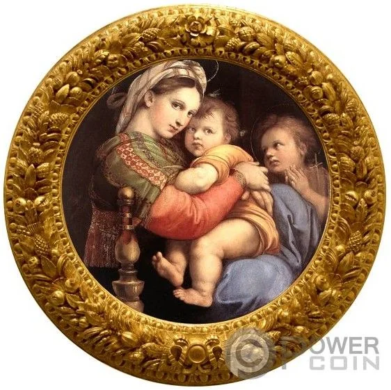 Raphael's "Madonna della Seggiola" (c. 1513-14), framed by a wreath.