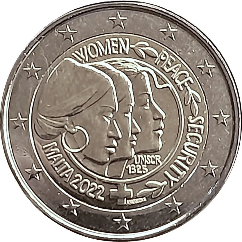 Three female faces appear beside the inscriptions ‘WOMEN’, ‘PEACE’, ‘SECURITY’, ‘2022’, and ‘MALTA’. Below the faces are ‘UNSCR 1325’. The outer ring features the 12 stars of the European flag.