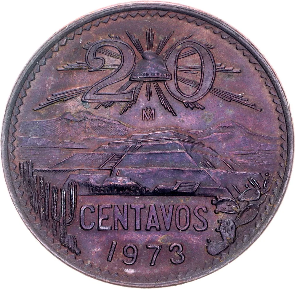 Top: value and Liberty cap with mint mark. Center: Pyramid of the Sun at Teotihuacán, flanked by the volcanoes Popocatépetl and Iztaccihuatl. Bottom: value and date.
