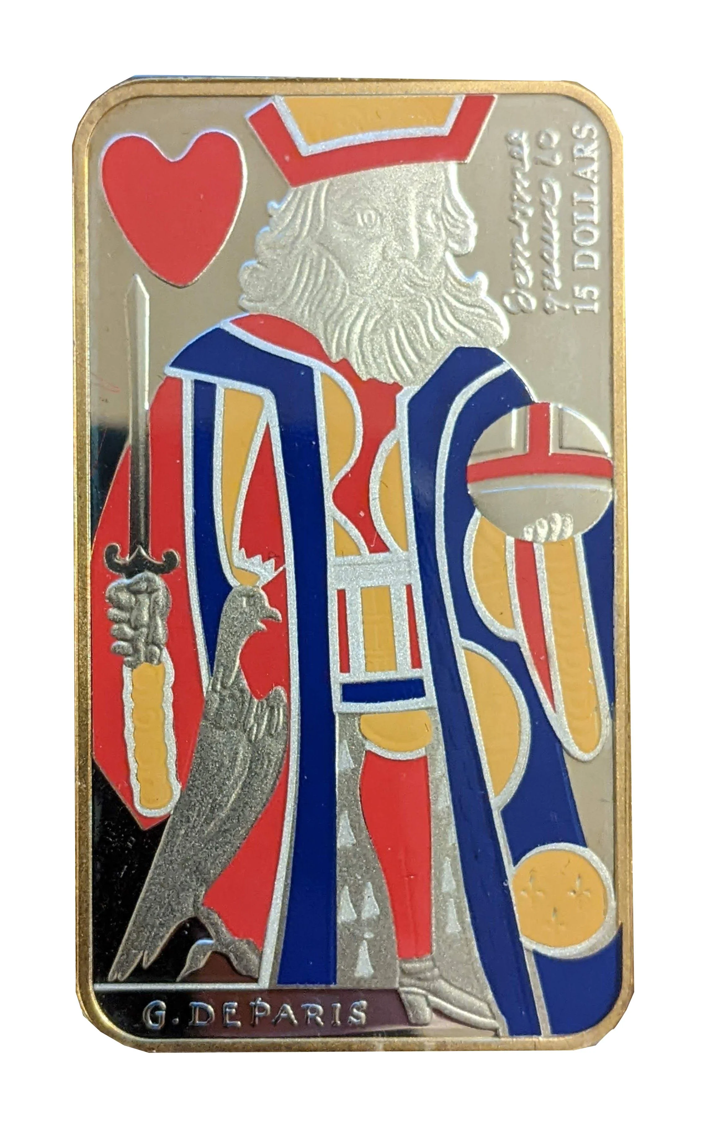 A reproduction of New France's "playing card money," featuring the King of Hearts (Charlemagne) in a patterned cloak amid fleur-de-lis symbols, based on a Canadian archives card.