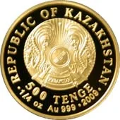 Description: The obverse features Kazakhstan's coat of arms, with "500 TENGE" below. Around the edge, "REPUBLIC OF KAZAKHSTAN", "1/4 oz Au 999", and "2009" are separated by dots.