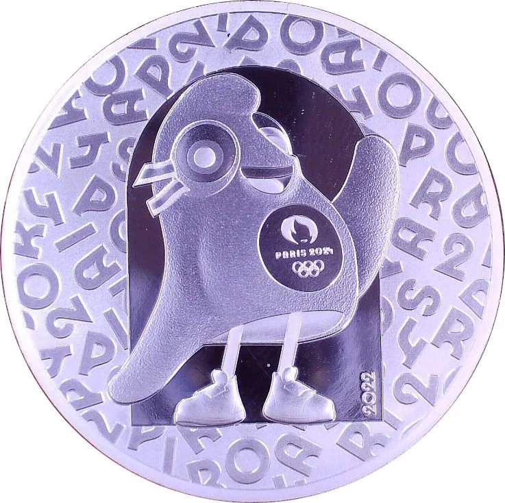 Official Paris 2024 Olympic mascot. Background features the word "PARIS 2024" in fragmented letters.