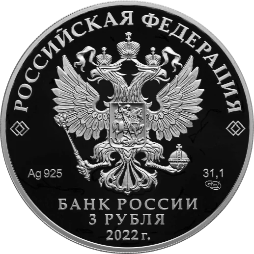 The obverse bears the Russian Federation coat of arms, inscriptions for "РОССИЙСКАЯ ФЕДЕРАЦИЯ," "БАНК РОССИИ," "3 РУБЛЯ," the year 2022, metal specifications, and the mint mark.