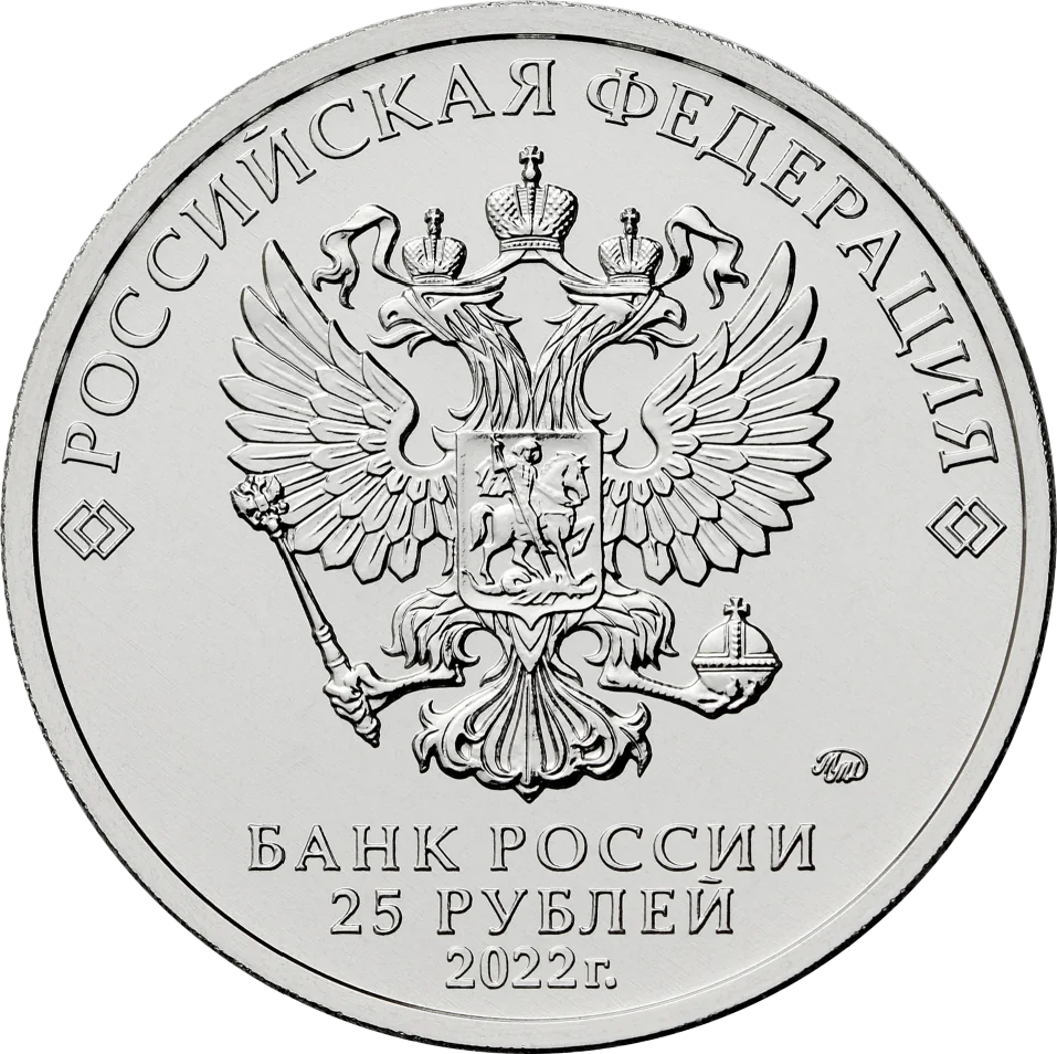 The obverse features the Russian Federation coat of arms with "РОССИЙСКАЯ ФЕДЕРАЦИЯ" above, framed by diamonds. To the right is the mint mark. Below are the inscriptions "БАНК РОССИИ", "25 РУБЛЕЙ", and "2022 г."