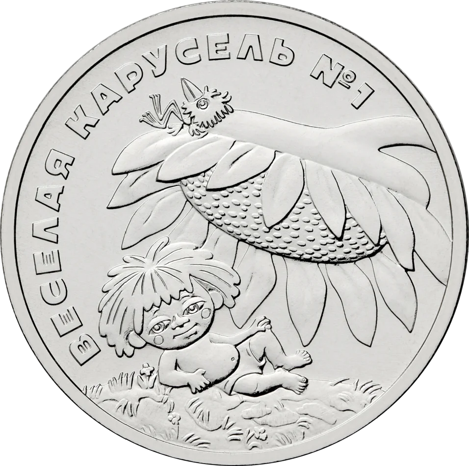 The coin depicts a scene from 'Happy Merry-Go-Round No. 1' with its title inscribed on the upper left.