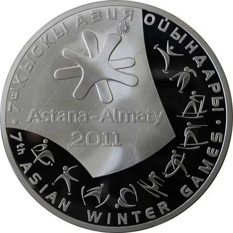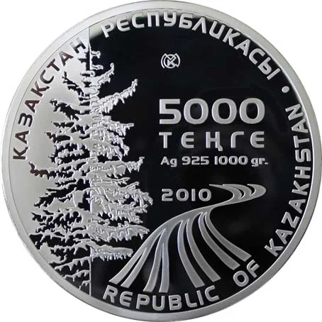 Description: The obverse features the denomination "5000 ТЕҢГЕ", the metal specification "Ag 925 1000 gr.", a stylized ski track with the year "2010", the Kazakhstan Mint trademark, and an image of a Tien-Shan spruce. The rim inscriptions are "ҚАЗАҚСТАН РЕСПУБЛИКАСЫ" and "REPUBLIC OF KAZАҚSTAN".