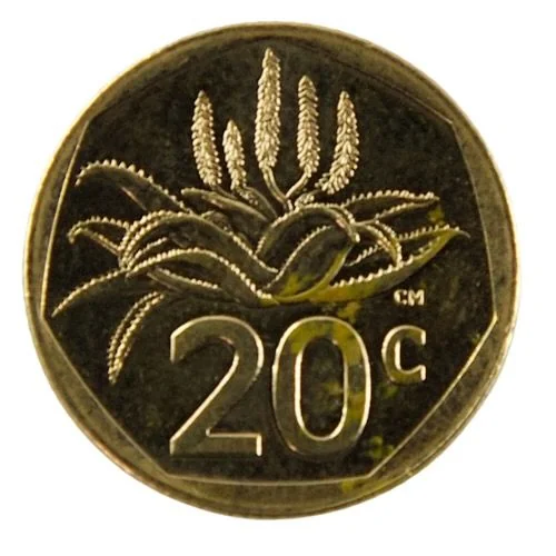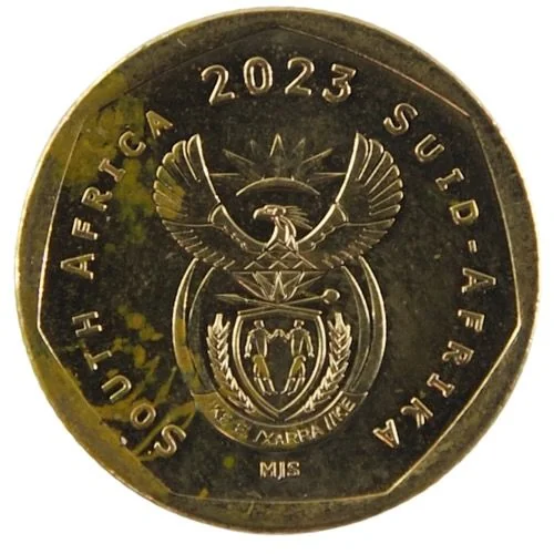 Coat of arms with date above; "South Africa" in English left, Afrikaans right.