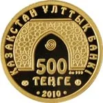 The coin's center features a stylized arch and heraldic spiral symbolizing the entrance to Islamic shrines, along with the face value "500 ТЕҢГЕ" and metal purity "Au 999". Around the circumference are the inscriptions "ҚАЗАҚСТАН ҰЛТТЫҚ БАНКІ", the National Bank logo, the year "2010", and the Kazakhstan mint's trademark.