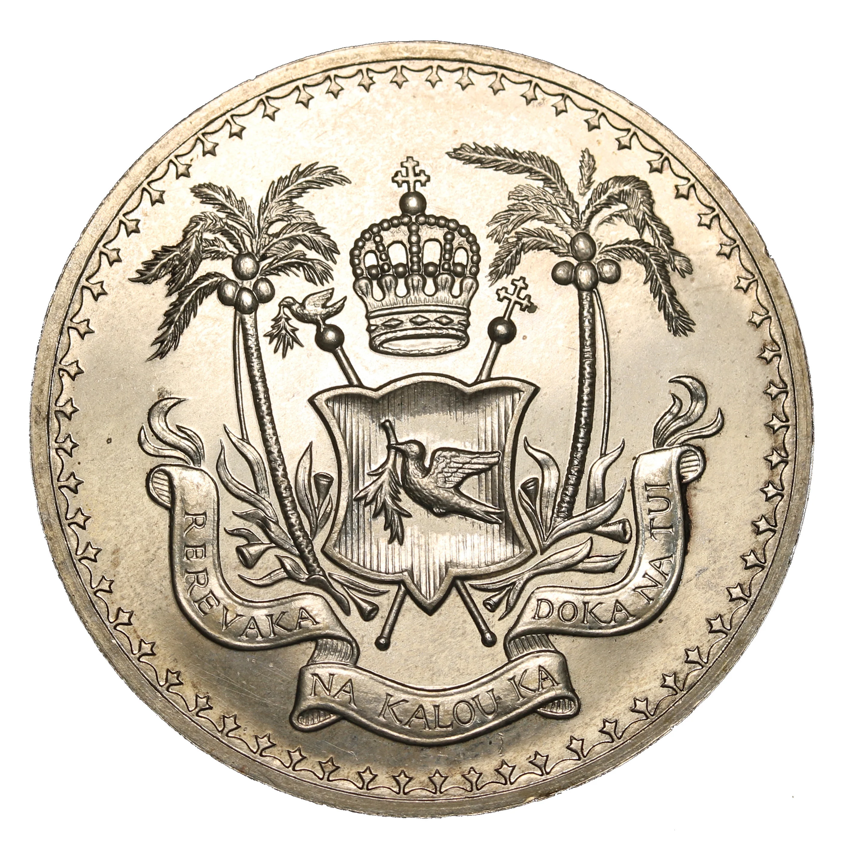 The 1871 Royal Coat of Arms of Fiji: a shield with a dove and olive branch, crowned and flanked by palm trees.