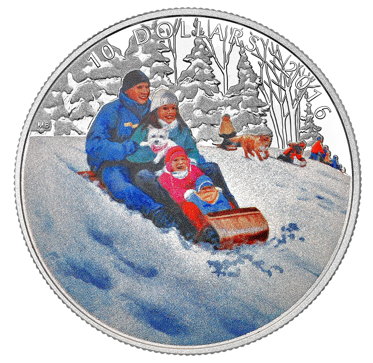 Families and pets toboggan on a snowy day.