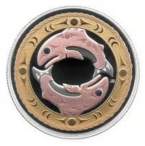 Two tyee salmon circling, symbolizing life's cycle. Rose and yellow gold plating.