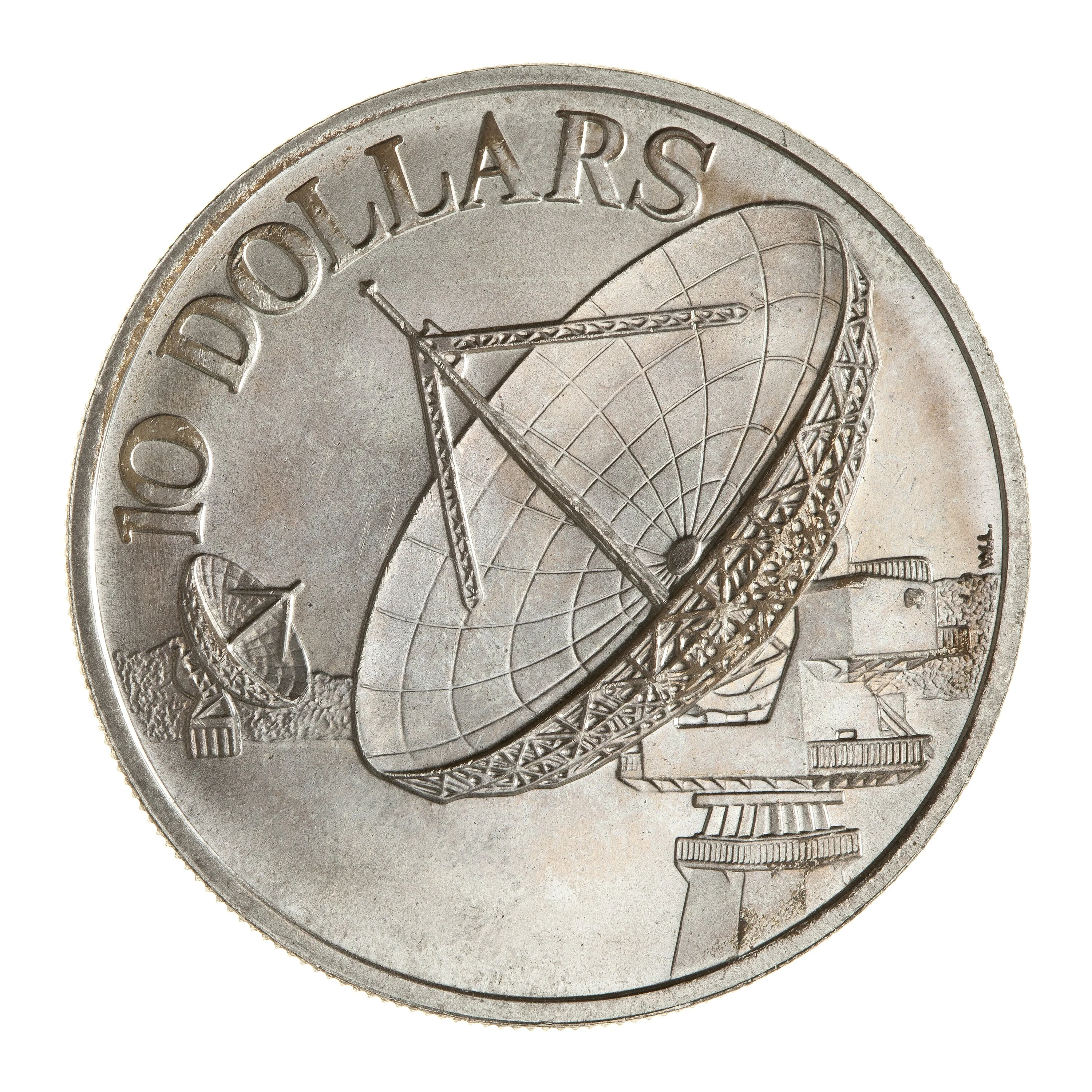 Central right: large satellite dish. Left: smaller dish. Denomination above.
