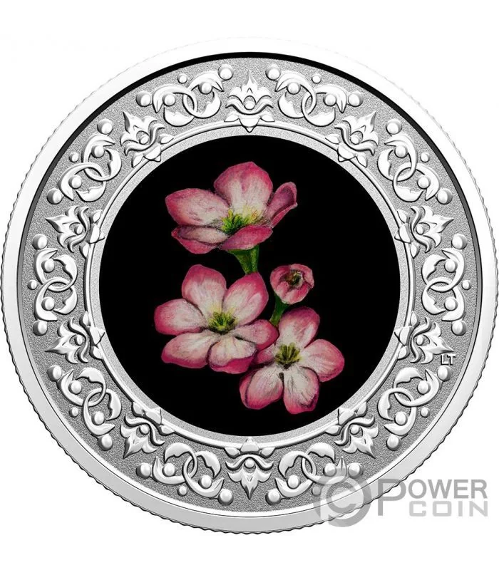 The reverse design features a stylized floral ring encircling a colour portrait of Nova Scotia’s floral emblem, the trailing arbutus (mayflower).