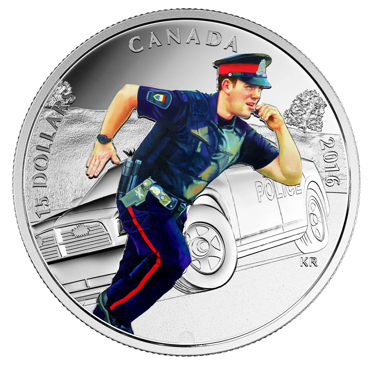 A police officer in action, with an engraved police car parked roadside near a treed, open landscape.
