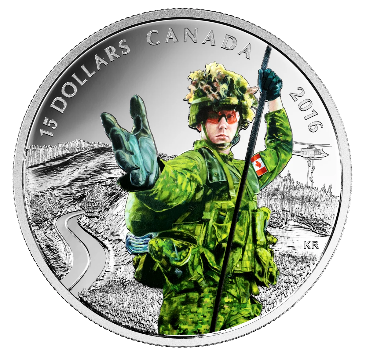 A soldier grips a rappelling rope and reaches to help, his Canadian flag patch vivid on his camouflage. Behind him, a helicopter operates in a wooded rescue scene.