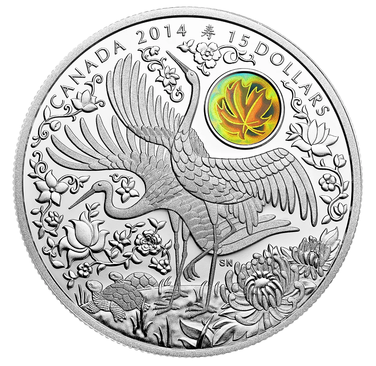 This intricate design combines many Chinese "longevity" symbols—including cranes, tortoises, chrysanthemums, and seasonal flowers—to convey a blessing for long life. It also features a hologram of a maple leaf. "CANADA," "2014," the Chinese symbol for "longevity," and "15 DOLLARS" are engraved at the top.