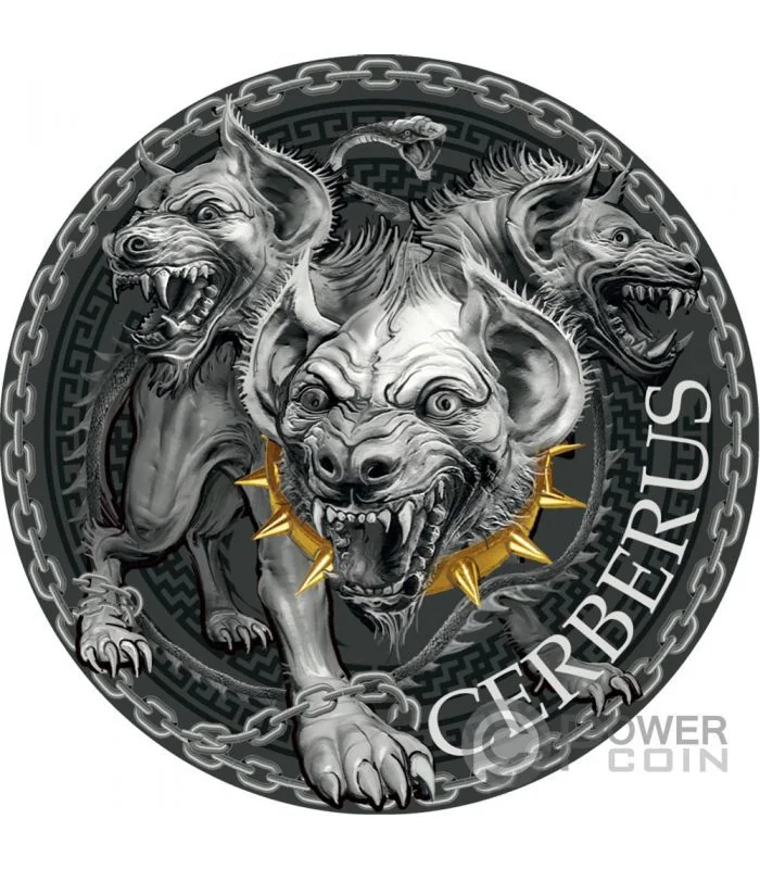 Chained Cerberus, meander border, chained rim.