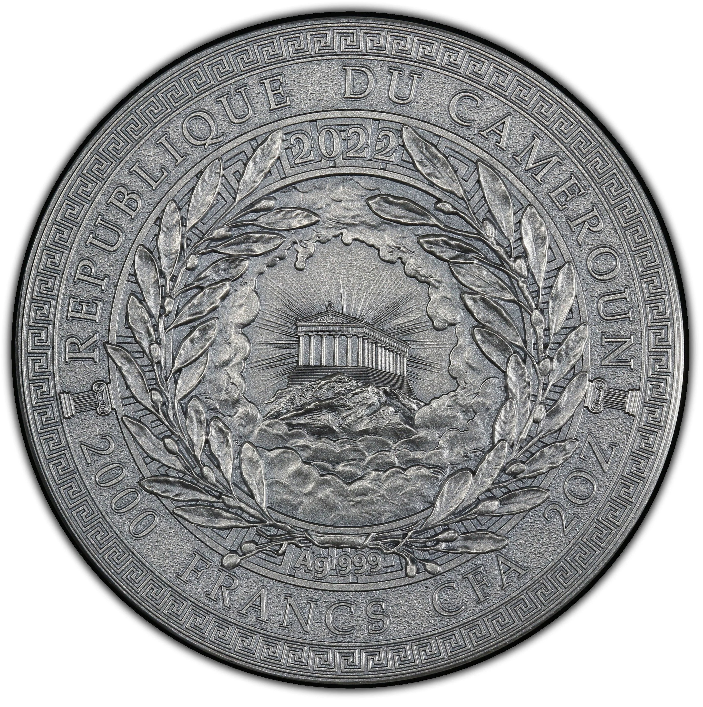 Temple on Mount Olympus encircled by a wreath, with a meander border.