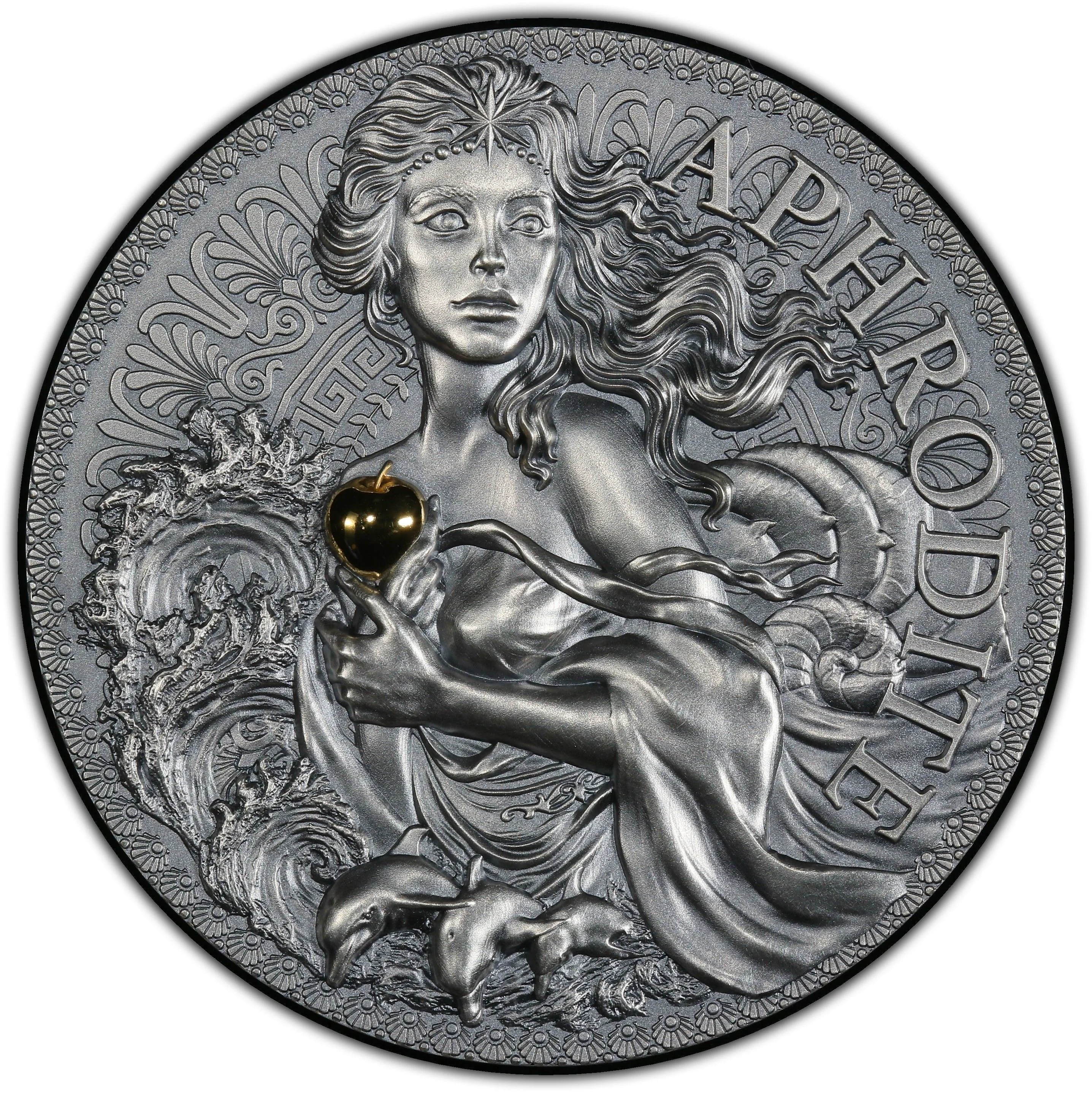 Aphrodite left, head turned back, holding apple. Dolphins lower left, waves left, seashells right.