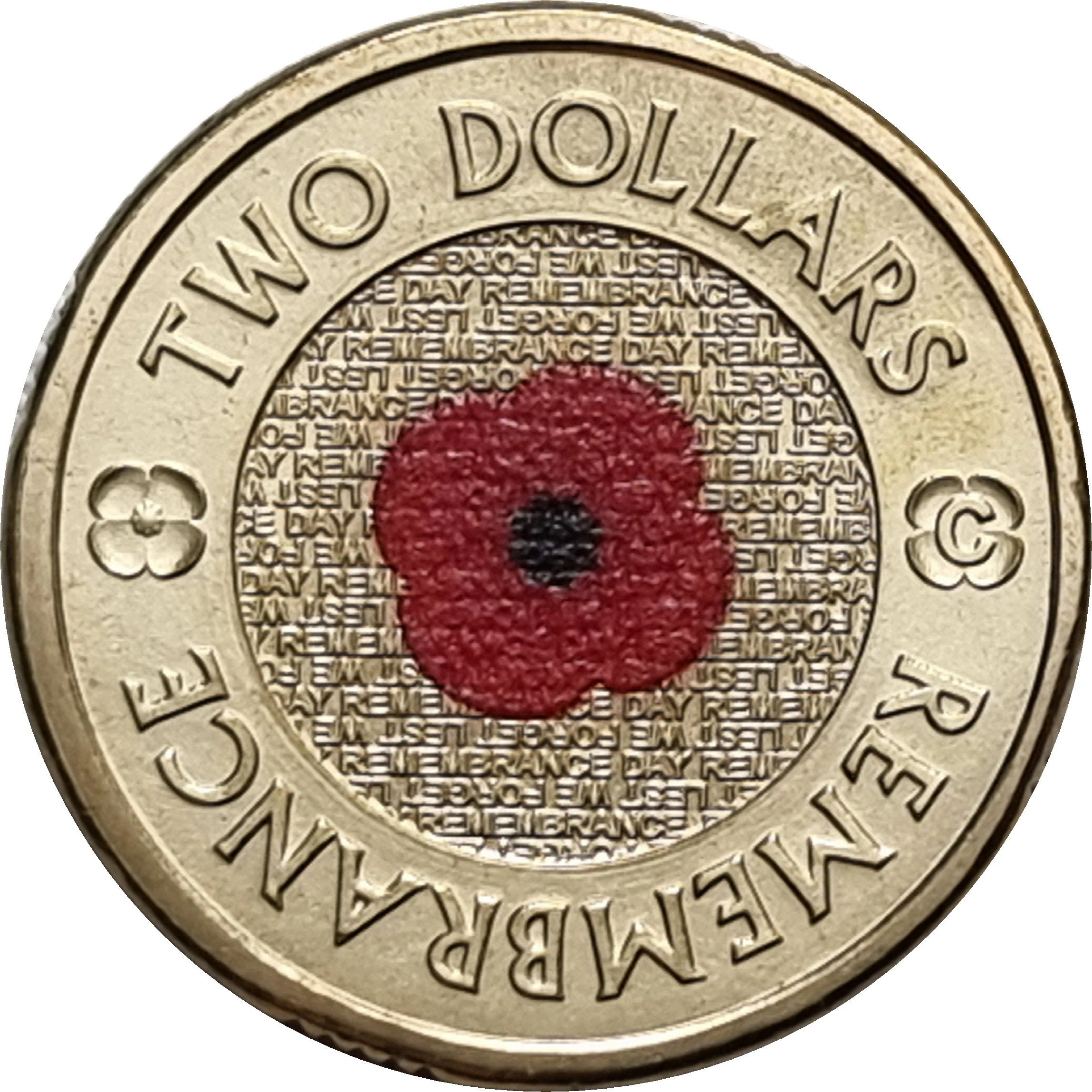 Red poppy design with "Lest we forget" and "Remembrance Day" in micro-text. Small "C" mintmark on the right poppy.
