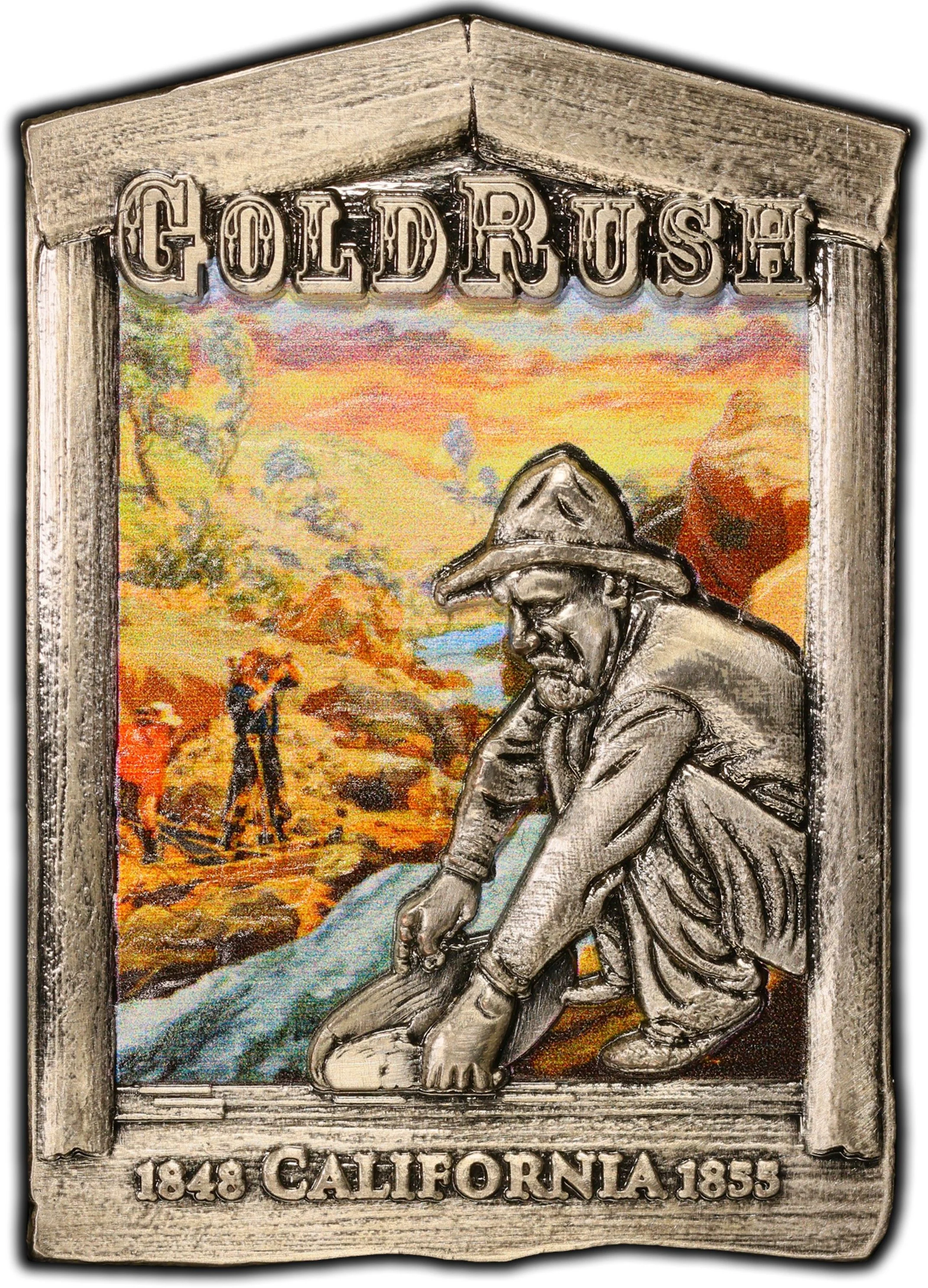 A gold prospector searches a riverbank against a backdrop of hills and other figures.