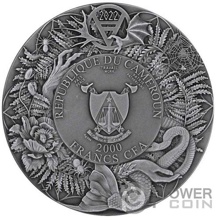 Description: Cameroon's coat of arms encircled by flora, fauna, and hands.