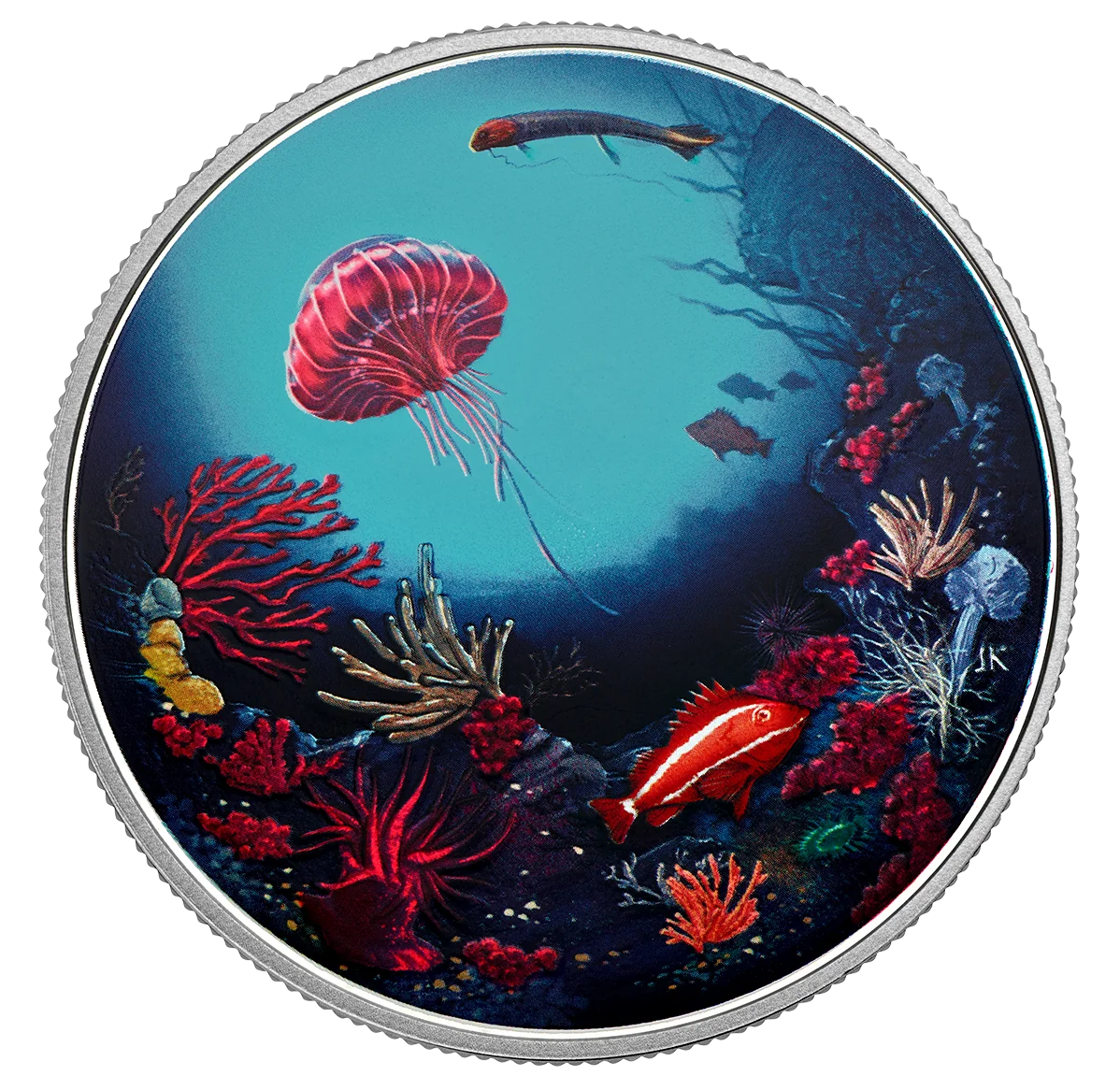 A view from a deep reef off Canada's West Coast, looking up toward turquoise surface waters. Brightly colored marine life includes a large Atolla jellyfish, several yelloweye rockfish, and a high-fin dragonfish among other seafloor organisms.