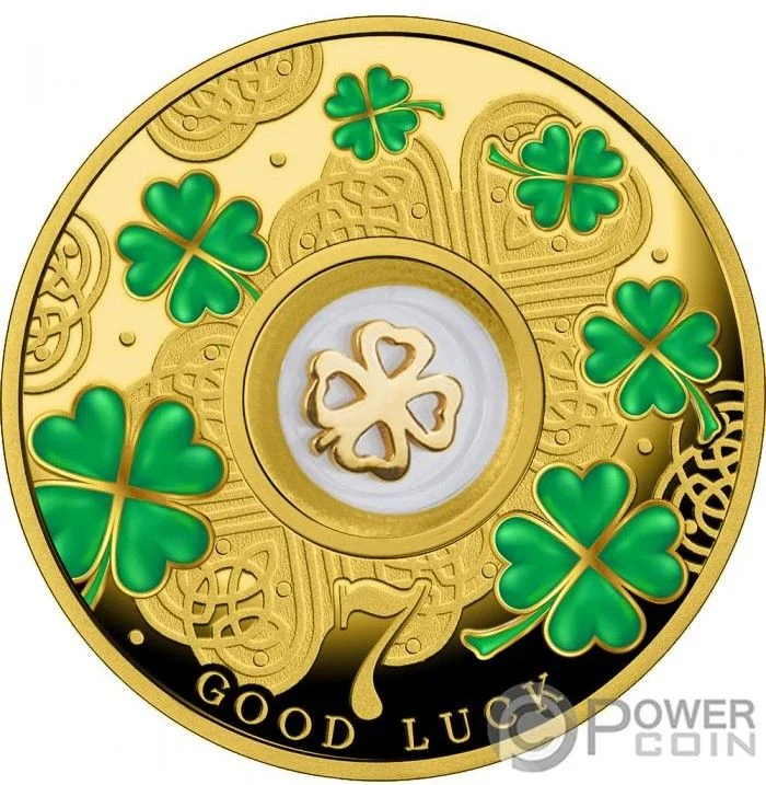 Golden clover in a central circle, surrounded by horseshoe, elephant, and flowers.