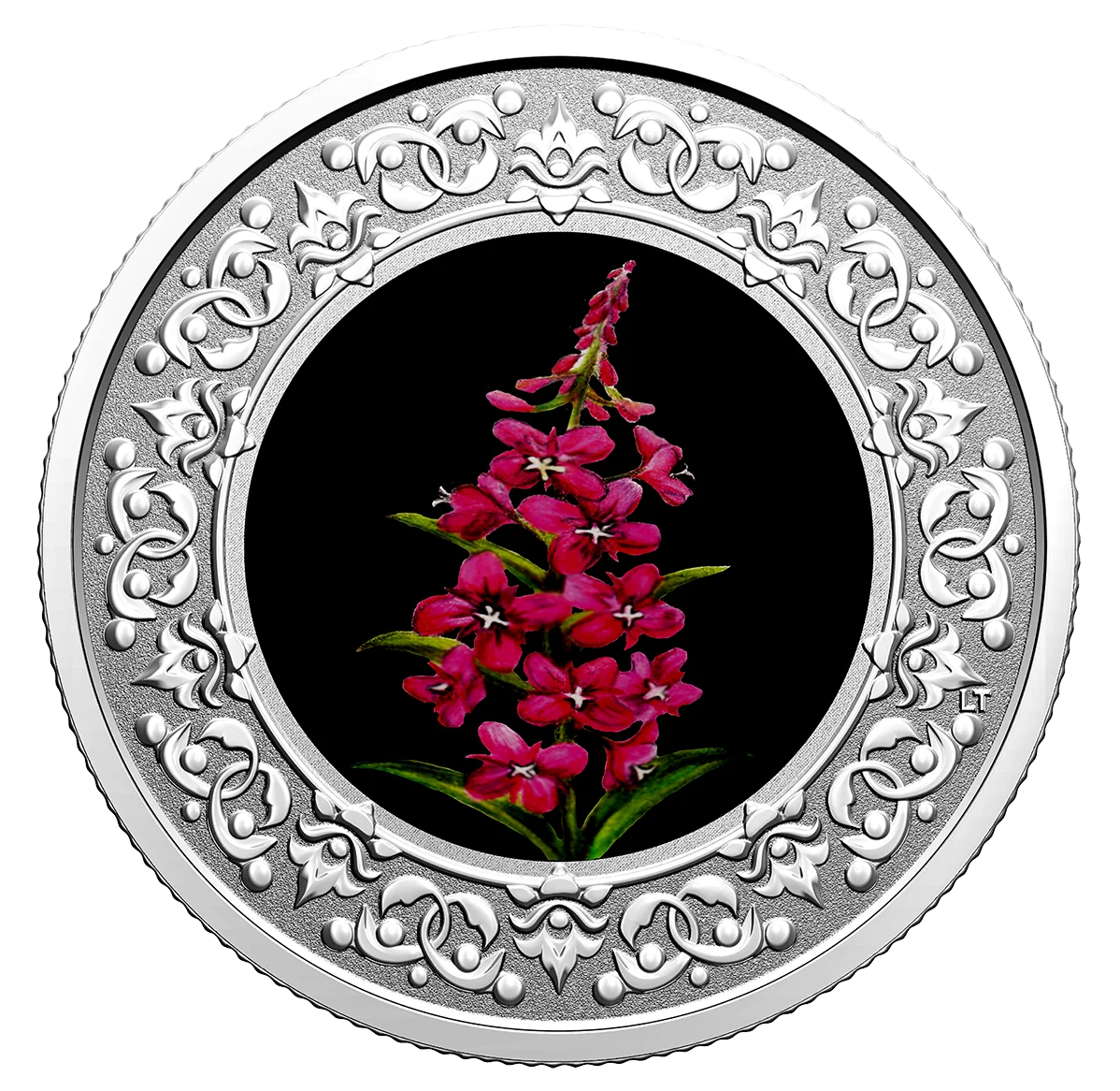 The reverse design features a stylized floral ring encircling a colour portrait of Yukon's official floral emblem, the fireweed.