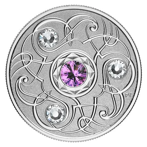 This reverse design by Pandora Young merges art and mathematics with a base-six pattern. Inspired by the Celtic triskele, it features three Swarovski® crystals and a central crystal celebrating February's birthstone.