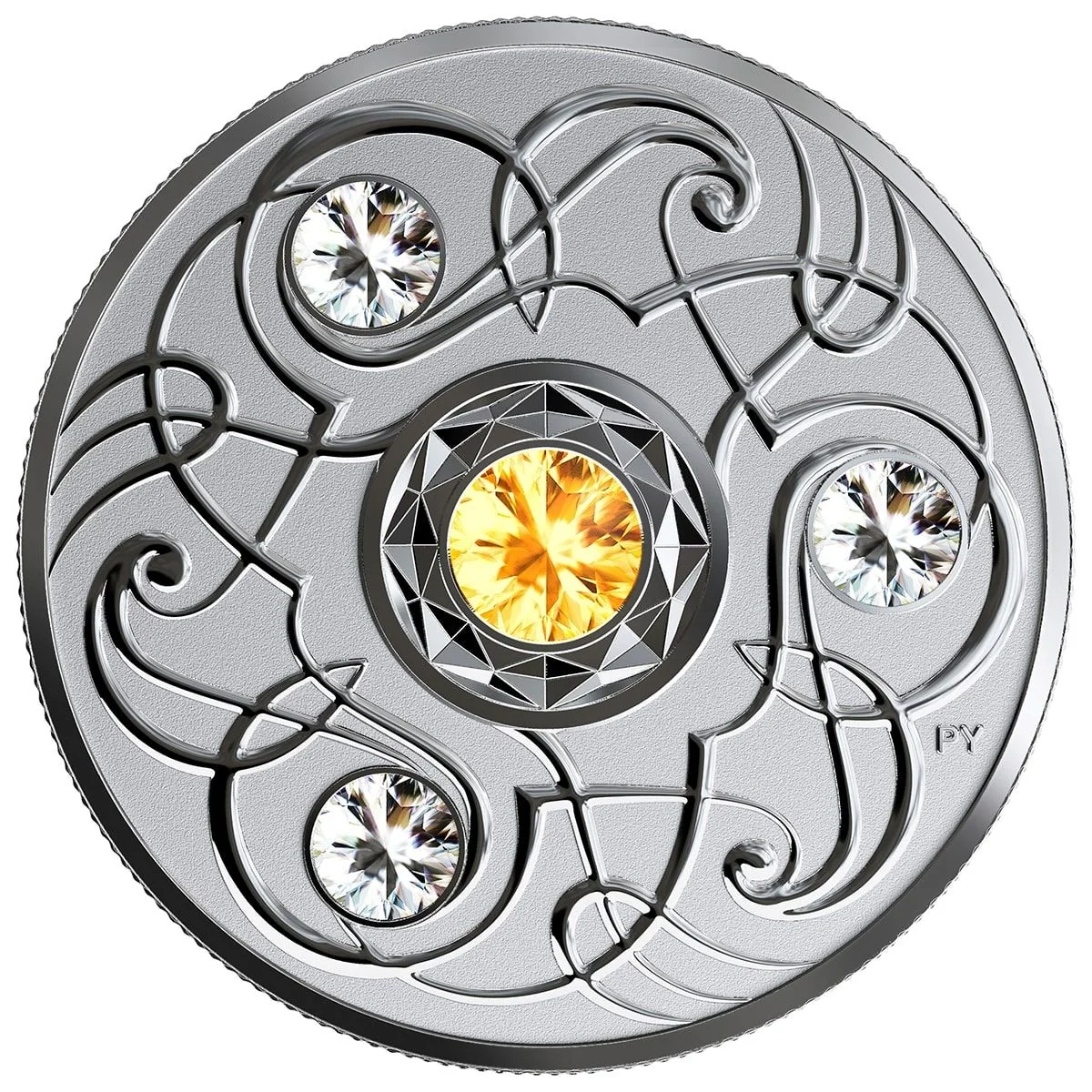 This reverse design by Pandora Young merges art and mathematics with a base-six pattern. Inspired by the Celtic triskele, it features three Swarovski® crystals and a central crystal representing November's birthstone.