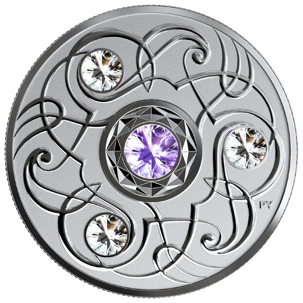 This reverse design by Pandora Young merges art and mathematics with a base-six pattern. Inspired by the Celtic triskele, it features three Swarovski® crystals and a central December birthstone crystal.