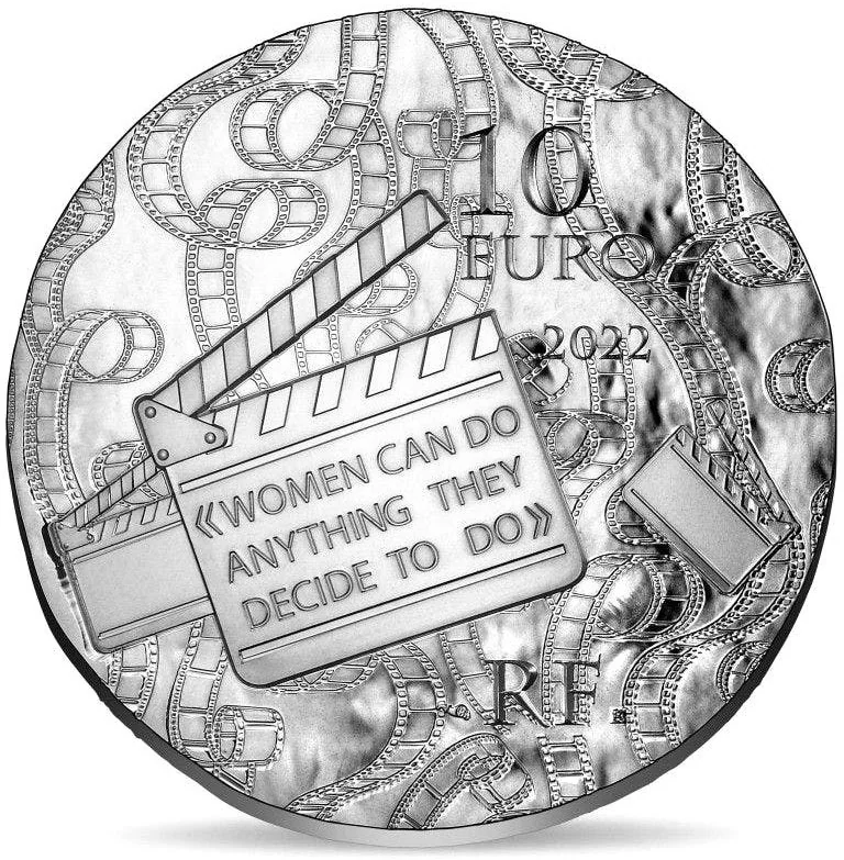 This coin's face value, vintage, and "RF" inscription accompany motifs from Grace Kelly's life: film reels, clappers, and her quote, "WOMEN CAN DO ANYTHING THEY DECIDE TO DO."