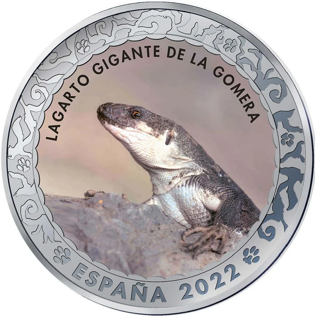 A colorful La Gomera giant lizard image surrounded by floral motifs and animal tracks.