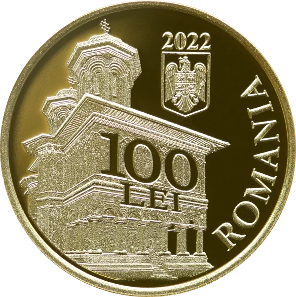 Kretzulescu Church in Bucharest, year 2022, Romanian coat of arms, face value 100 LEI, and "ROMANIA" inscription.