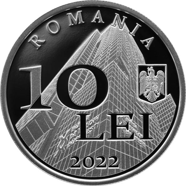 Bucharest Stock Exchange headquarters, "ROMANIA" in an arc, coat of arms, face value 10 LEI, and issue year 2022.