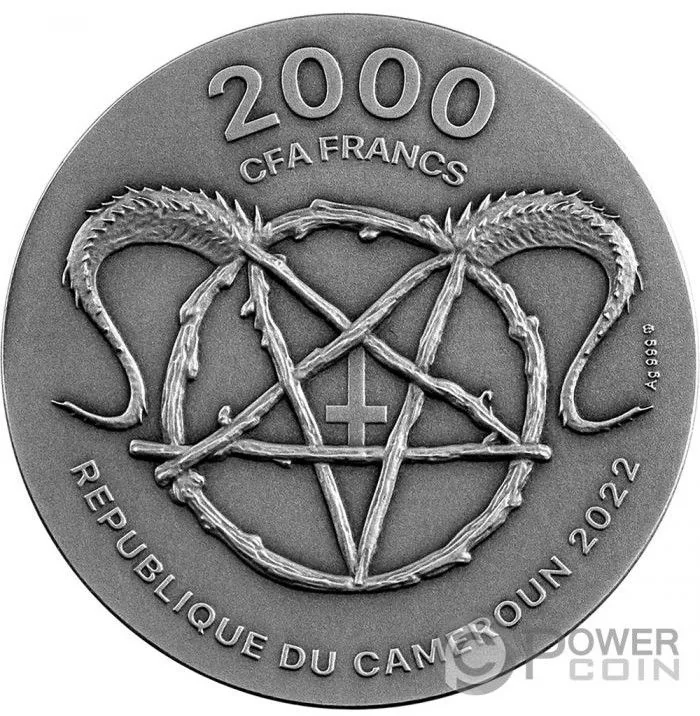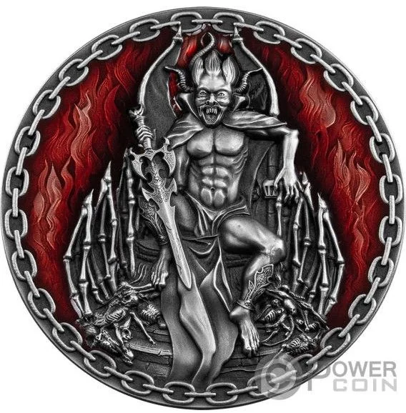 Mephistopheles seated front-facing on a throne, a sword in his right hand, a chain encircling the rim.