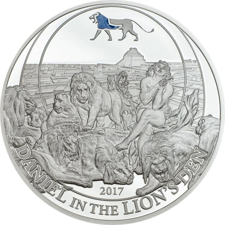 Daniel among lions with Jerusalem behind him.