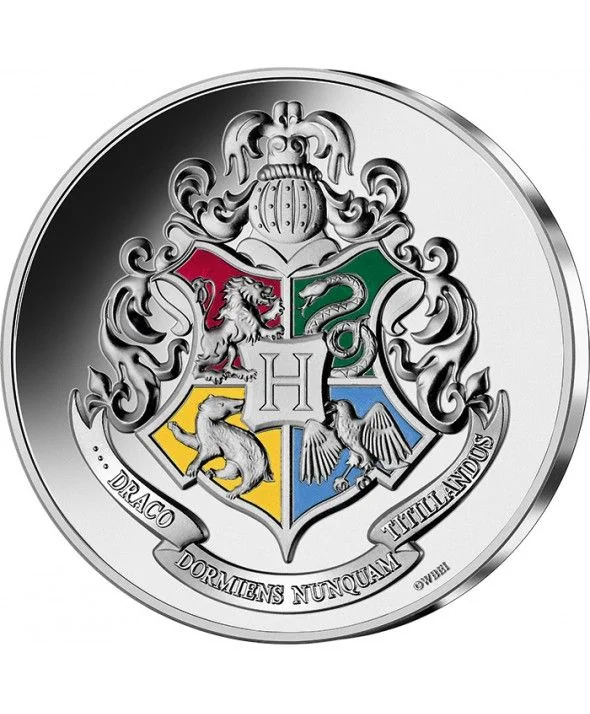 Hogwarts coat of arms with its house emblems: Gryffindor's lion, Hufflepuff's badger, Ravenclaw's eagle, and Slytherin's snake.