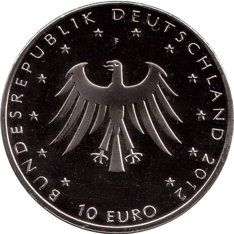 The stylized federal eagle and EU stars are centered on the coin. Above is "BUNDESREPUBLIK DEUTSCHLAND". Below are the year "2012" and face value "10 EURO". The Stuttgart mint mark "F" is above the eagle. References to silver are omitted to distinguish it from the silver issue.